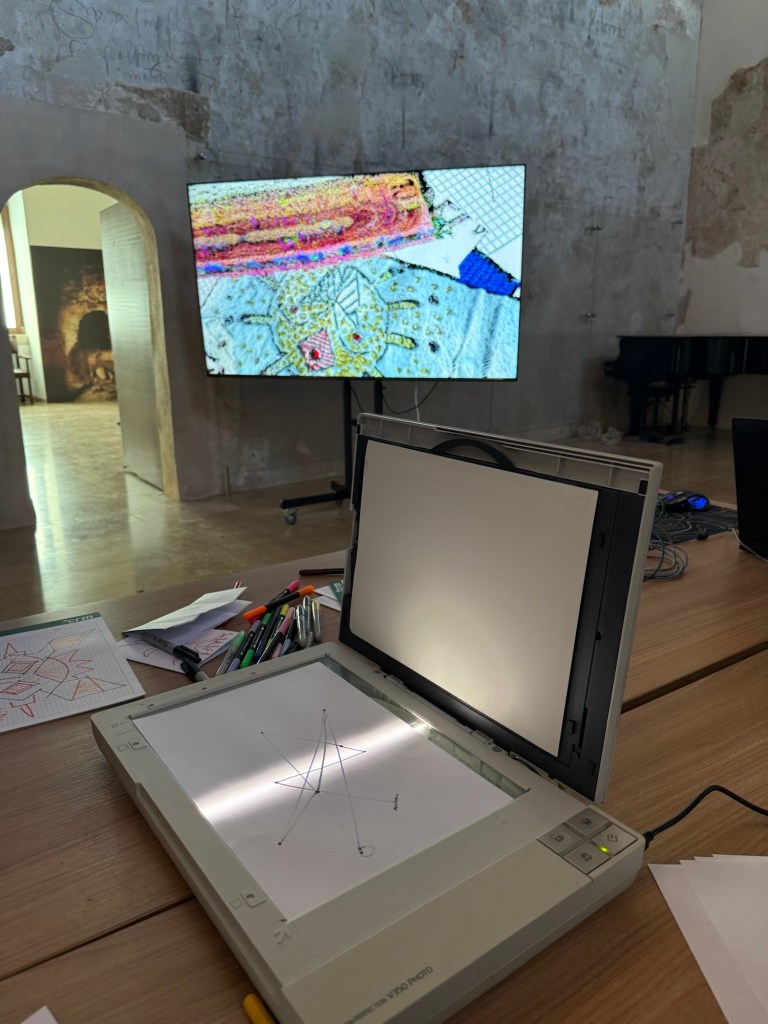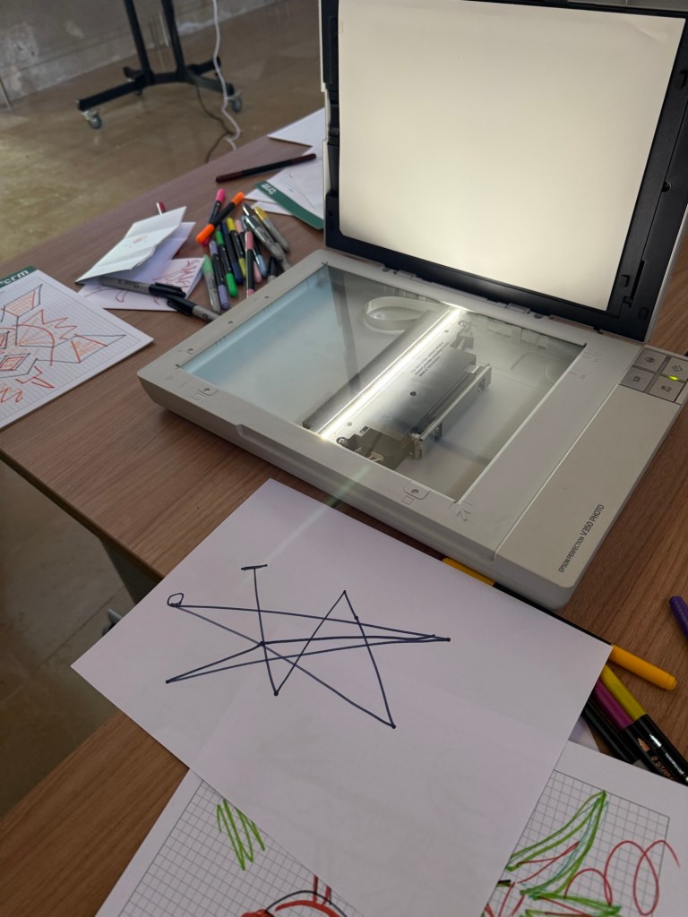 What we were invited to do is to create some kind of text or drawing or something on the paper and then put it into the scanner. The scanner would then scan whatever it was we put onto it and then incorporate that into what was going on with the screen which I’m assuming was plugging into the whole of the Internet and incorporating our input into it I’m not exactly sure how it worked. That’s why I really wanted to go back and talk to the people that were running it.. anyway when I did it, I incorporated the sigil that I’m working with at the moment.