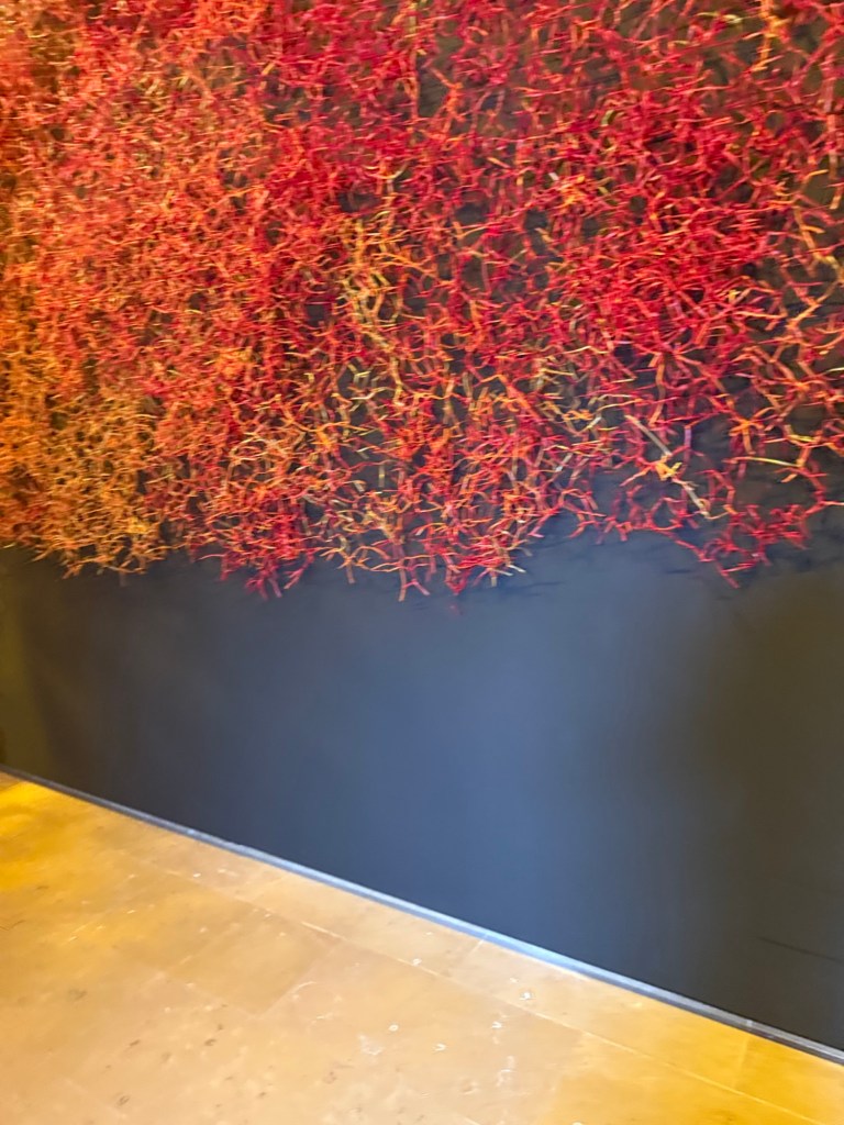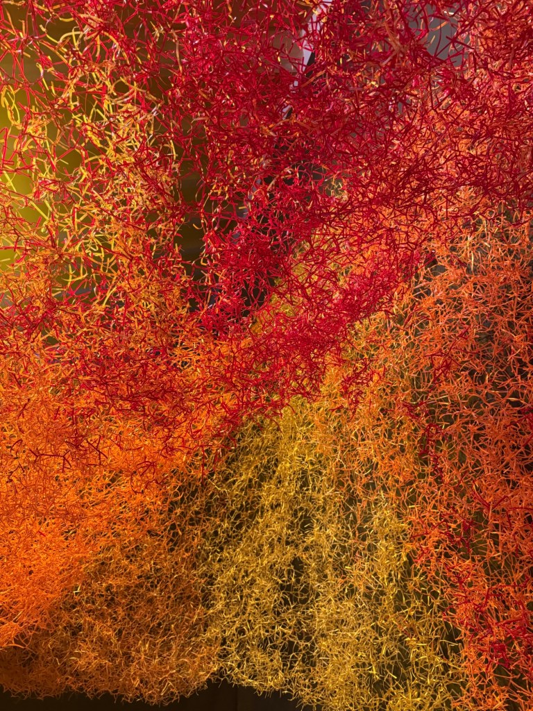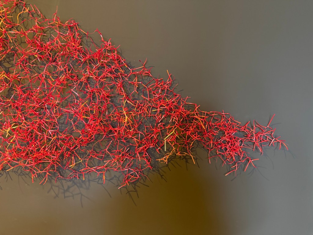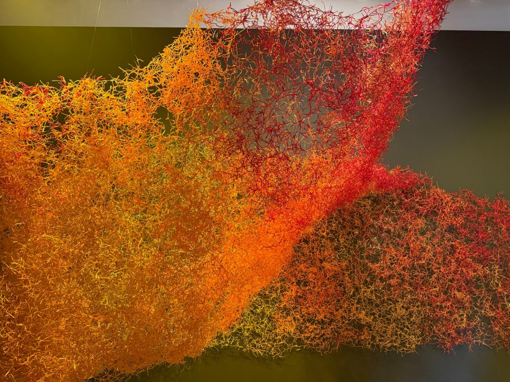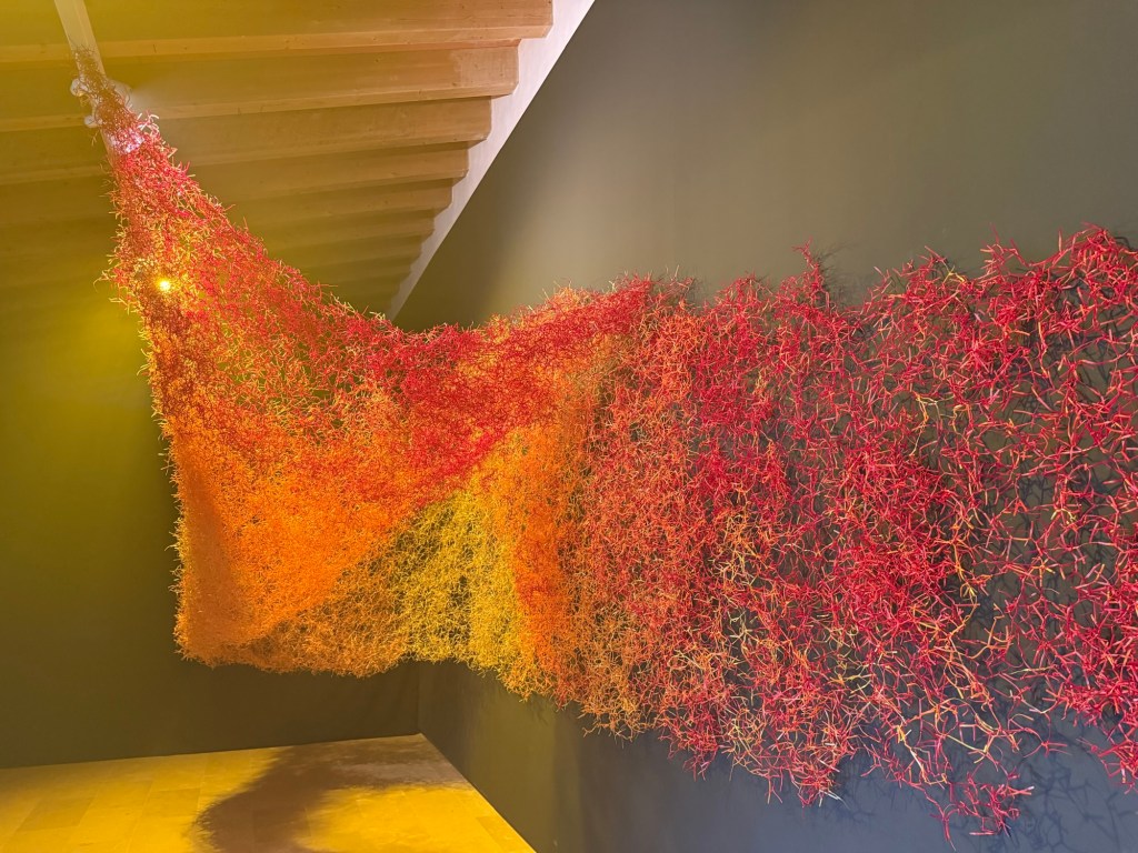 Claudia Martinez’s marvellous “Desborde” is a huge, expansive woven mass made of shreds of orange plastic with a wire core in red, orange, and gold. The structure, made of approximately 100,000 metres of wire and 3 million knots, expresses the fractal concept, a knot that repeats itself infinitely and connects the various parts of the mesh with a wide range of permutations.