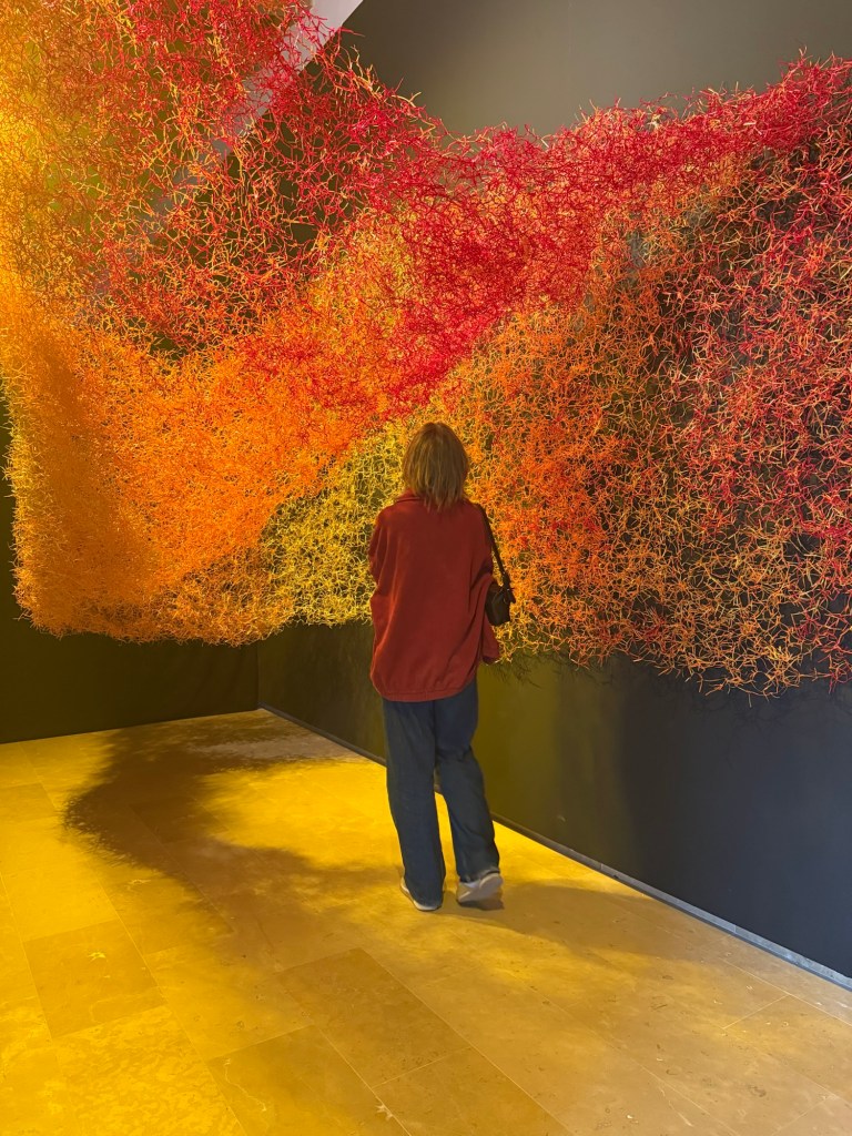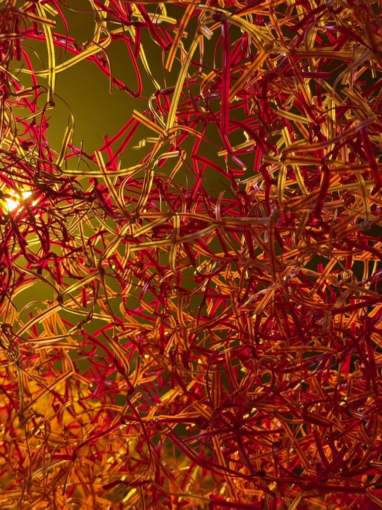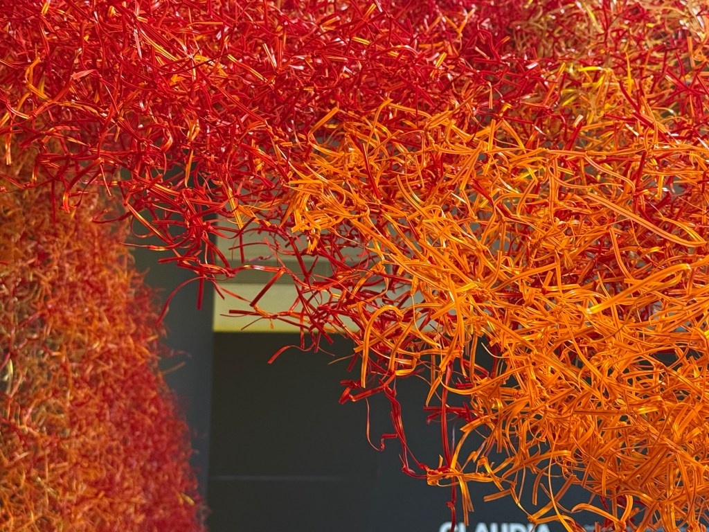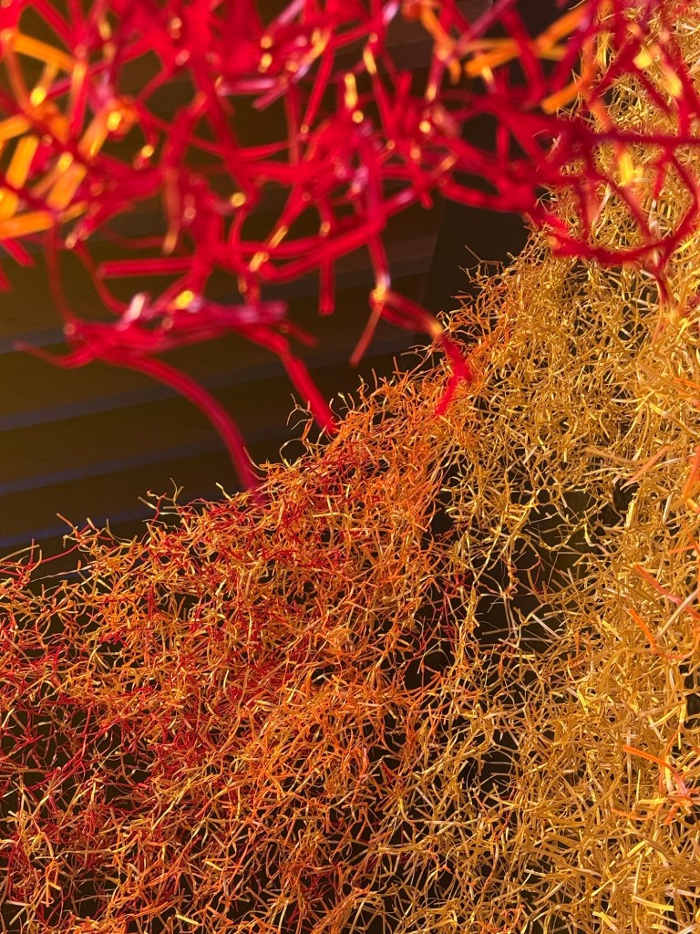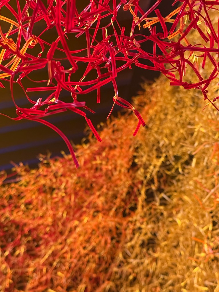 Claudia Martinez’s marvellous “Desborde” is a huge, expansive woven mass made of shreds of orange plastic with a wire core in red, orange, and gold. The structure, made of approximately 100,000 metres of wire and 3 million knots, expresses the fractal concept, a knot that repeats itself infinitely and connects the various parts of the mesh with a wide range of permutations.