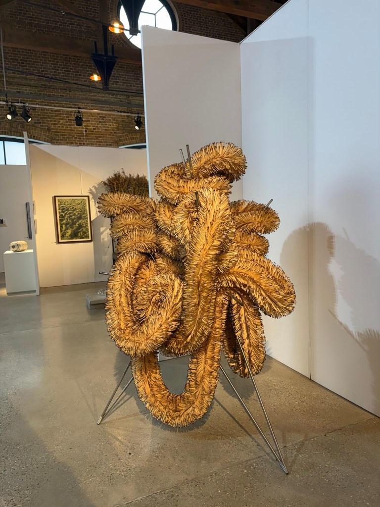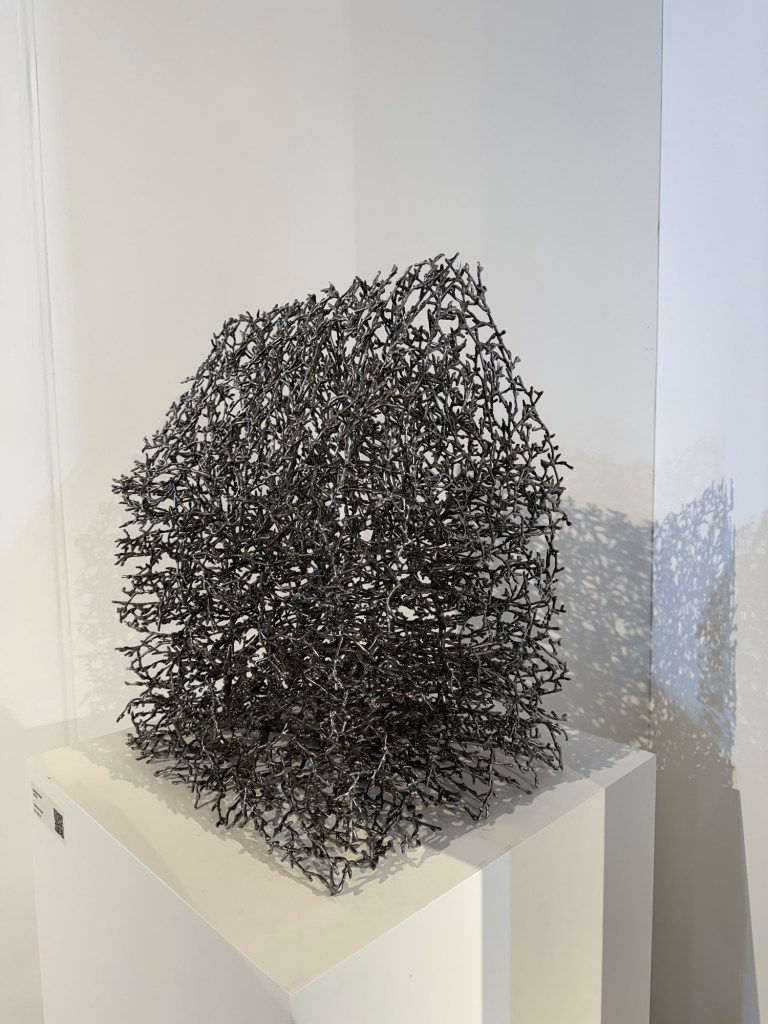 Instead, it forms an interdependent structure, supported solely by friction and tension. What a metaphor that is! Each element shapes and supports itself and the others—together, they make up the whole. In short, it’s a model of the universe, an ecosystem, existence itself. It takes time to really look at it. At first, it’s quite bombastic: large, spiky, fascinating, and just a bit odd—in a good way. But the more you contemplate it, especially the process of its making, the more you’re drawn in. It reminds me a bit of that piece I saw by Claudia Martinez the other week, where the meticulous and painstaking assemblage of tiny parts results in something truly profound.