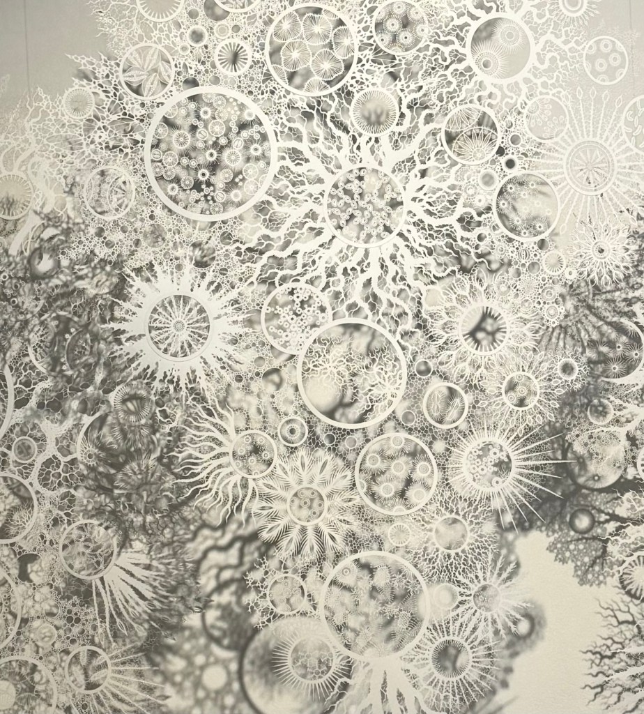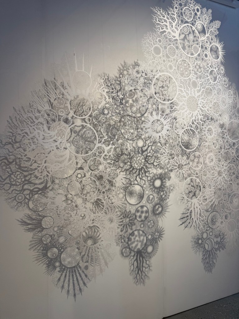 This large and incredibly detailed cut paper collage is especially striking as it is white on a white wall – and so you get not only the exquisiteness of the cut paper but also the shadow which has its own quality altogether. Brown’s observation of nature is aided by technology, particularly scientific imaging – microscope, satellites et cetera – offering the artist both microcosmic and macrocosmic imagery of the world and indeed the universe far beyond the limitations of the human eye
