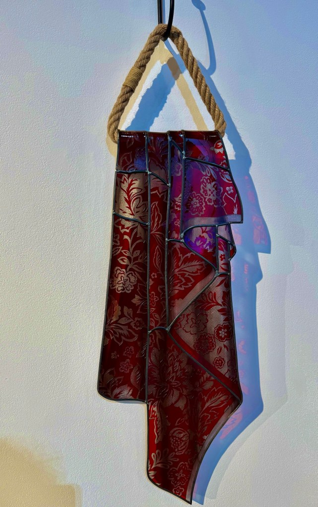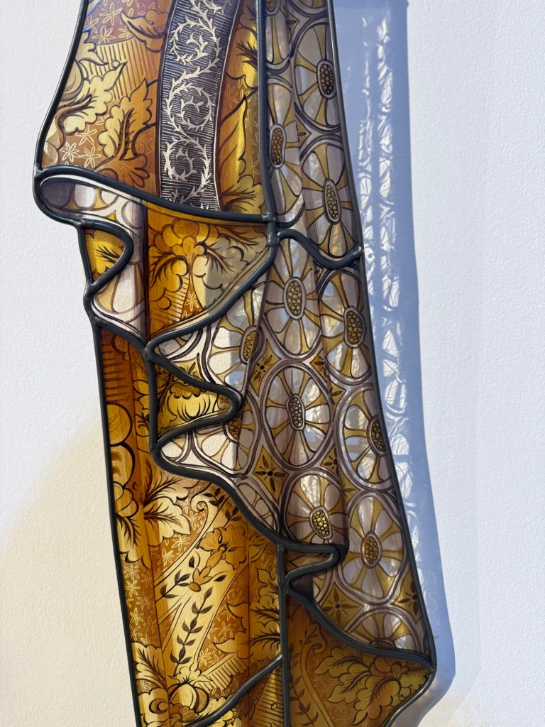 Drapery Studies is a series of works that observe and examine the fall, weight and subtleties of textile, and draws inspiration from the carved drapery of classical sculpture. It also echoes the stylised fabrics depicted in traditional stained glass windows and indeed in painting. I was strongly reminded of the drapery seen in paintings, especially portraits of the 16th 17th and 18th centuries. I’m reminded especially of the lavish and sumptuous folds of the dresses of Van Dyke’s and Gainsborough’s sitters. At the same time the presence of the coarse rope offers a jarring counterpoint to the delicate beauty of the glass. It suggests a cleaning cloth, a scarf or a handkerchief casually stowed, hanging in a convenient spot.. the juxtaposition is enticing and provocative.