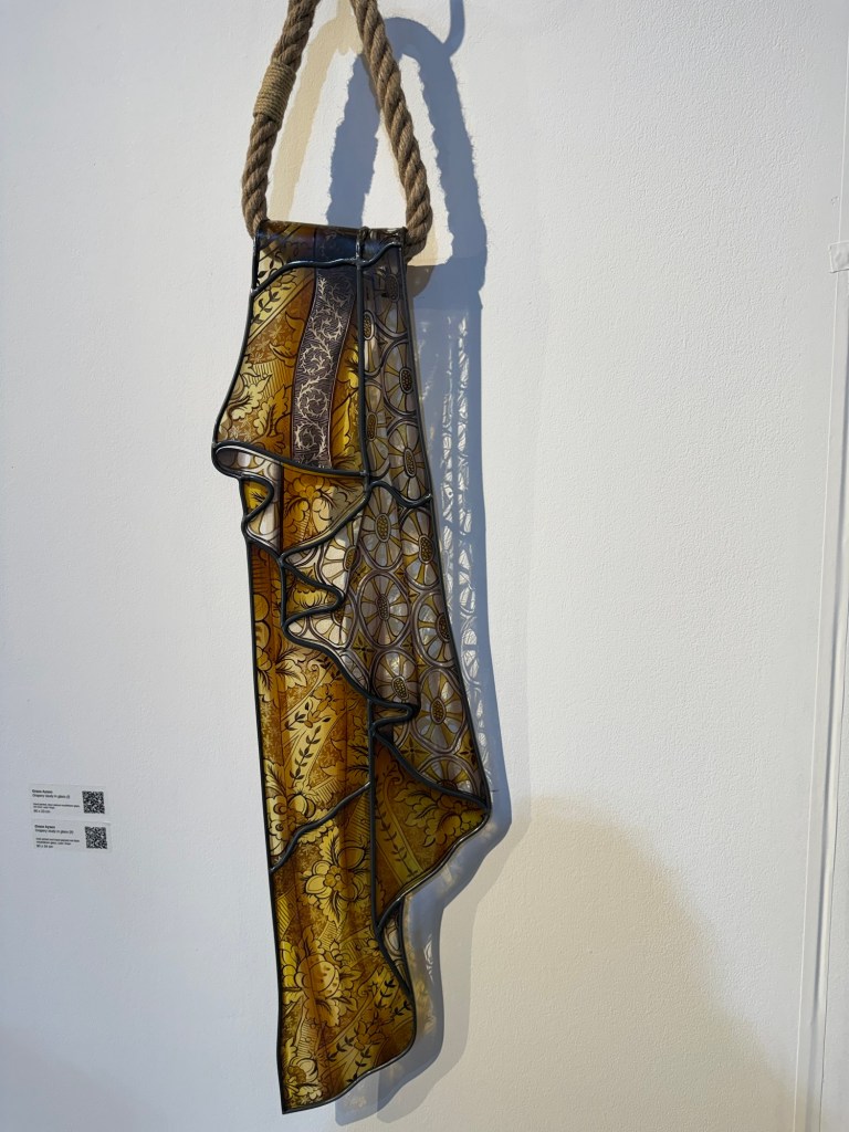 Ayson’s work was my favourite in the show and although I very often leave my favourites until last I just couldn’t resist starting with this exquisite work she presents two pieces of hand painted silver stained mouth bone glass suspended from rope and looking convincingly like draped transparent silk . A masterpiece of trompe l’oeile, Ayson’s silk flutters and shimmers and you can swear that it is fluttering in the breeze yet it clearly cannot – and there is no breeze. It’s so convincing and compelling is the work that although you know exactly that it’s glass you’re very tempted to believe that it is not. I love this idea of teasing the viewer but in such a sumptuous and generous way it makes the work not only exquisite but also fun and that’s always a good thing.