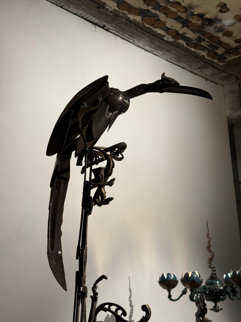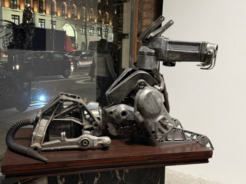 I’ve had about two glasses of Prosecco and caught up with all the gossip. Things are starting to get a bit comfortable, yet that is not what I came here for. I came here to see art that would blow my mind. I did see it when I arrived; as I approached, I could see wonders through the windows of the large space on Marylebone Road. It was full of giant hunks of metal crafted into incredible forms. I saw fossils, dogs, birds, and all manner of creatures — all of them made from scrap metal.