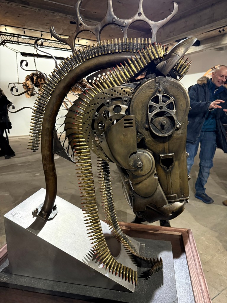 The Mutoid Waste Company is legendary in British art history, even if the standard art historians haven’t really given it its due. Founded in the 1980s, it is an art collective renowned for its innovative use of scrap metal and discarded materials, transforming waste into striking sculptures and immersive installations. Their work blurs the boundaries between art, engineering, and activism, often making bold statements about recycling and urban regeneration. Joe Rush co‑founded the group and has long been its pivotal figure. His creativity and commitment to environmental themes have made him a prominent influence on contemporary urban art. He has many fans in the more alternative and underground sectors of the art world — but as I said, he’s not an outsider artist either. It’s an interesting place to be, but I think the most important thing about his work is his absolute, unwavering commitment to artistic freedom, expressing what he believes in and doing it through art.